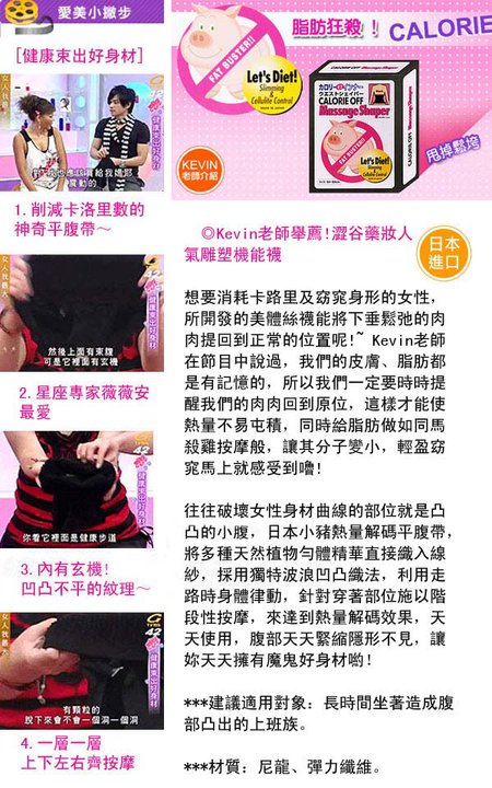 日本美妆杂志强烈推荐!只要走路就能热量解码,天天穿~凸凸小腹悄悄不见啦! 往往破坏女性身材曲线的部位就是凸凸的小腹,日本小猪热量解码平腹带,将多种天然植物匀体精华直接织入线纱,采用独特波浪凹凸织法,利用走路时身体律动,针对穿著部位施以阶段性按摩,来达到热量解码效果,天天使 用,腹部天天紧缩隐形不见,让你天天拥有魔鬼好身材哟! 使用方法:睡觉、上班前穿上,可以改腰与腹部线条,轻松热量解码,运动时穿更有效,若腰部感到不适,则请视情况脱 下。
