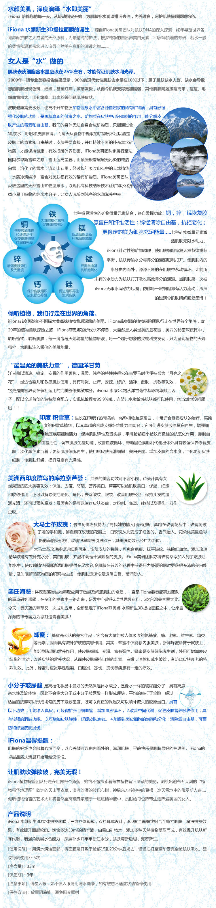 三维立体剪裁,双挂耳式设计,360度全面细致贴合至每村肌肤,魔法提拉效果,有提升面部伦敦,饱含多达33ML 精华液,由雪山矿物水, 添加多种天然植物萃取而成, 有提升肌肤新陈代谢,增加角质层水合能力,深度补水并牢牢锁住水分,肌肤清新明亮。。