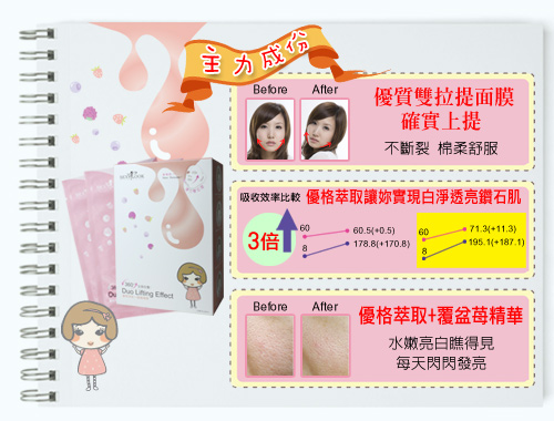 ◆使用方式:於清潔肌膚後,將面膜輕敷於全臉,把面膜左