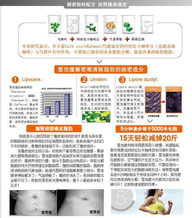 Description : 使用说明:(使用周期)早晚各一次,用于清洁皮肤之后,睡前做最佳。 使用方法: 充分摇匀:在充分摇匀到听不到水声后,瓶身直立挤压出适量的雪泡。 用力按压:取适量(按压直径约3cm的泡沫与手心),以画圈的方式由内而外按摩部位2~3分钟。 均匀涂抹:将按摩过的部位配合轻微或中度运动。 减肥产品您可千万小心,别图便宜买到假货,不但浪费钱,还伤害身体。