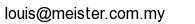 Company Particular| Company : | Meister Plastic Industries (M) Sdn Bhd | | Fax : | 03-7845 8327 | | Address : | No. 140-B-2, Lorong 10D, Kampung Baru Subang, 40150 Shah Alam, Selangor Darul Ehsan | | Email : |  | | Website : | http://meister.com.my |