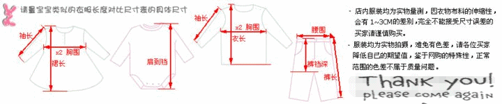 适合年龄:3 - 4岁 年龄只提供参考 货品以实际尺寸为准衣物布料有伸缩性,会有1-3CM的差别,不能接受尺寸误差买家请谨慎购买。尺寸:M [ 请在订单上的备注上注明要的尺寸 ]M : 衣长 43.5cm , 胸围 56cm